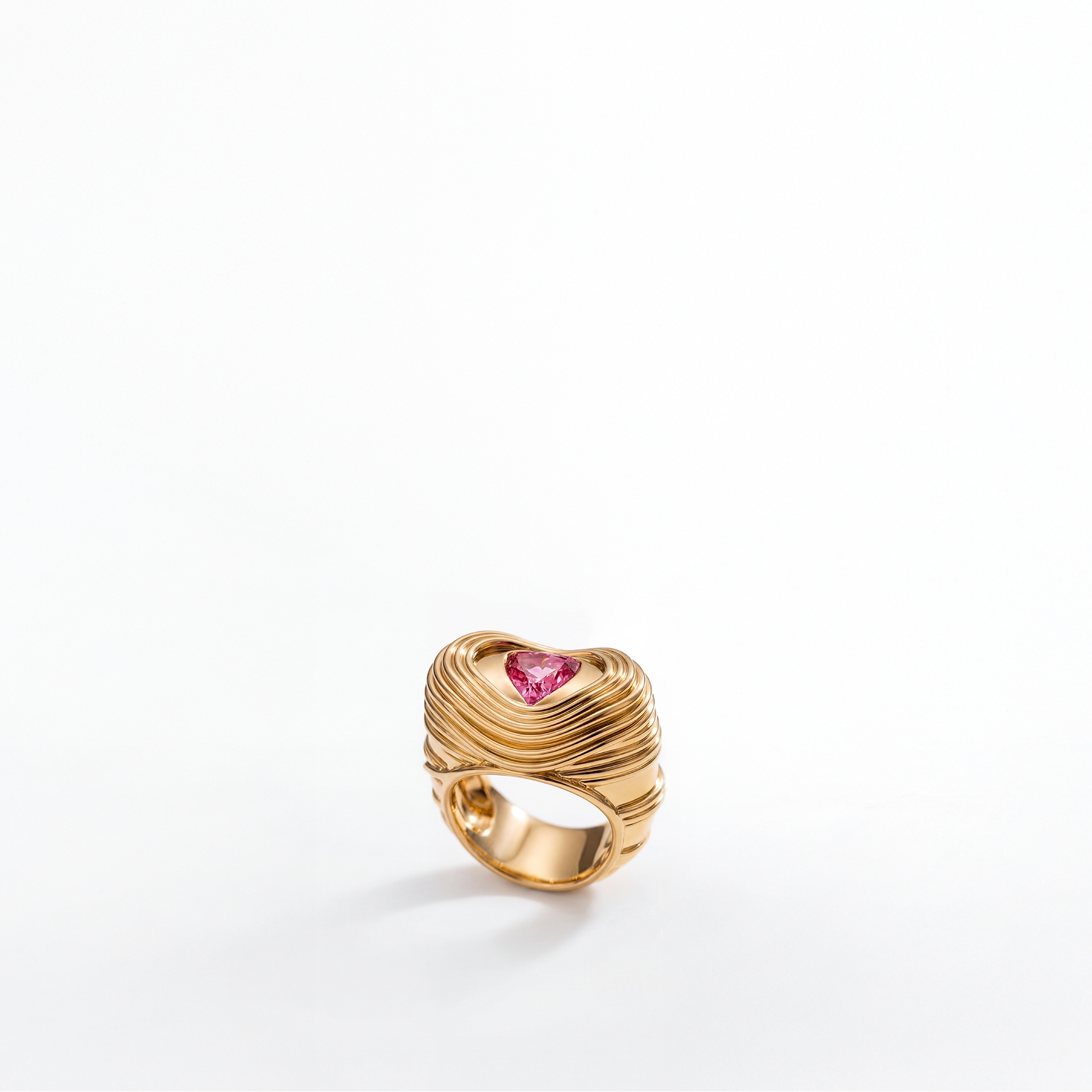 A joyful and sculptural celebration of love and design, our Love Pasta Ring unites organic form with fine gemstone artistry. Expertly handcrafted in rich 14k yellow gold, the band curves and swirls with the sensuous motion reminiscent of pasta shapes, delivering an artistic silhouette that is both modern and elegant. At its center sits a luminous, heart-shaped pink sapphire that radiates warmth and personality, creating a piece that is both playful and refined.